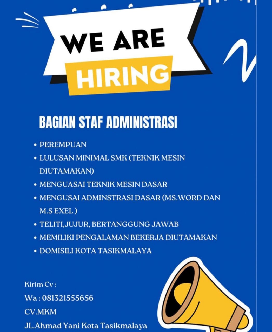 Kami dari CV. MKM Tasikmalaya membuka kesempatan bagi kamu yang berdomisili di Kota Tasikmalaya untuk bergabung bersama tim kami sebagai Staf Administrasi.